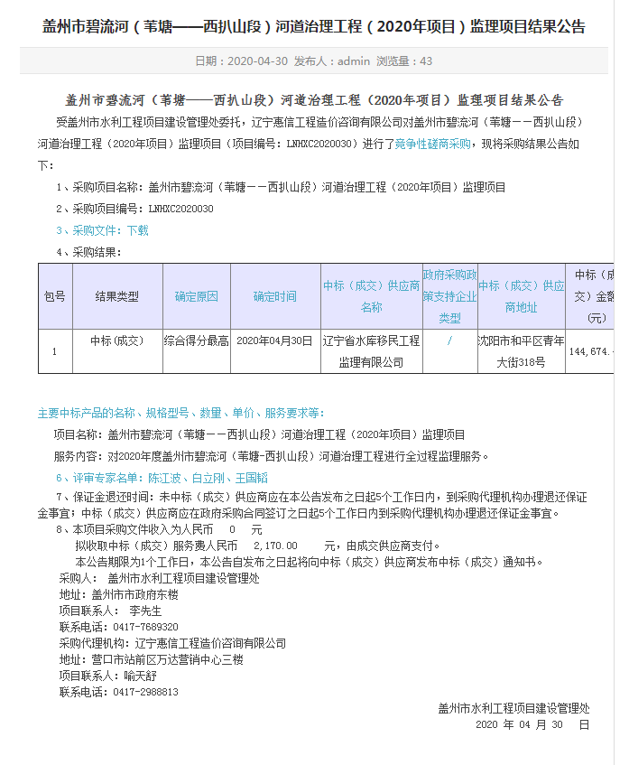 遼寧省水庫移民公司中標(biāo)蓋州市碧流河(葦塘——西扒山段)河道治理工程(2020年項(xiàng)目)監(jiān)理...