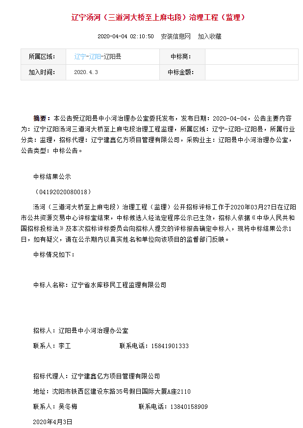 2020年4月3日,經(jīng)評標(biāo)委員會(huì)綜合評審,確認(rèn)遼寧省水庫移民工程監(jiān)理有限公司成功中標(biāo)遼寧湯河(三道河大橋至上麻屯段)治理工程(監(jiān)理)項(xiàng)目。